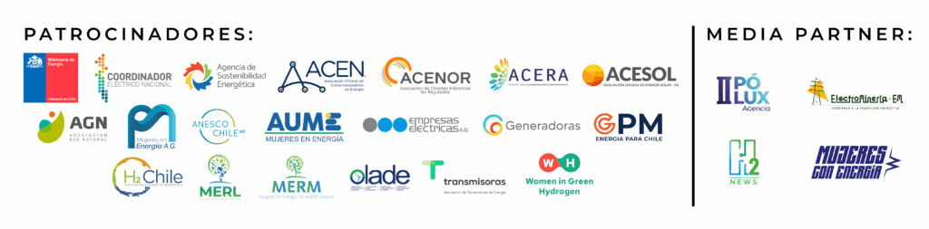 El foro contó con el patrocinio del Ministerio de Energía, el Coordinador Eléctrico Nacional y la Agencia de Sostenibilidad Energética, además de las principales asociaciones del sector: ACEN, ACENOR, ACERA, ACESOL, AGN, la Asociación de Mujeres en Energía, ANESCO, AUME (Uruguay), Empresas Eléctricas, Generadoras, GPM, H2 Chile, MERL, MERM, OLADE, Transmisoras y Women in Green Hydrogen. Así como el apoyo de los media partner: Agencia Pólux, Portal Electrominería, H2News y Mujeres con Energía (Paraguay).
