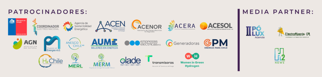 El foro cuenta con el patrocinio del Ministerio de Energía, el Coordinador Eléctrico Nacional y la Agencia de Sostenibilidad Energética, además de las principales asociaciones del sector: ACEN, ACENOR, ACERA, ACESOL, AGN, la Asociación de Mujeres en Energía, ANESCO, AUME (Uruguay), Empresas Eléctricas, Generadoras, GPM, H2 Chile, MERL, MERM, OLADE, Transmisoras y Women in Green Hydrogen, quienes se han sumado a esta iniciativa que busca acelerar una transición energética verdaderamente inclusiva.